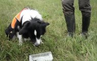 Die Reusen sind eine gute Methode, den Bestand der Molche in Gewässern zu erfassen. Doch dort halten sich die Tiere nur für einige Monate auf. Im Sommer verlassen die Molche das Wasser und sind im Sommer, Herbst und Winter an Land, unter Stein-, Laub- und Totholzhaufen zu finden. Um mehr über ihre Lebensräume und Strategien an Land zu erfahren, sind andere Untersuchungsmethoden gefragt. An dieser Stelle kommen Monitoring-Hunde ins Spiel. Sie werden darauf trainiert, die Molche an Land zu finden und möglichst störungsarm auf sie aufmerksam zu machen. Monitoring-Hund „Zammy“ war am 18. Tag des Molchfangs daher zu Trainingszwecken mit von der Partie. Vorerst wird er auf den Geruch der Molche konditioniert und lernt anhand von kurzzeitig an Land „ausgesetzten“ Tieren, diese zu finden. Beim Befehl „Check Molchi!“ weiß Zammy genau, was er zu tun hat: er erschnuppert den Molch und weist allein durch Schnauze und Augen auf den Aufenthaltsort des Molches hin – ohne zu bellen oder das Tier zu berühren.