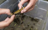 Mit extra aus Kanada eingeflogenen Fangreusen werden über etwa einen Monat lang die einzelnen Gewässer des Papitzer Lachenkomplexes untersucht – insgesamt 10 Reusen liegen für jeweils etwa 3 Tage in den verschiedenen Teichen. Kontrolliert und dokumentiert wird täglich. Die Wissenschaftler_innen halten alles genau fest: Jedes Individuum wird gemessen und gewogen, das individuelle Bauchmuster wird fotografiert, um Tiere bei späteren Fängen wiedererkennen zu können. Außerdem werden Abstriche von der Molchhaut genommen und im Labor untersucht. So will man herausfinden, ob der vielgefürchtete Chytridpilz, der für ein europaweites Amphibiensterben verantwortlich ist, auch die Amphibien der Papitzer Lachen bedroht. Natürlich werden die Tiere lebend gefangen – das Fangsystem basiert auf der Trichterform der Reusen, in welche die Tiere leicht hinein, aber schwieriger wieder herauskommen – und nach einer ausführlichen Untersuchung wieder freigelassen. Auch allerlei andere Wassertiere landen dabei in den Reusen: Gelbrandkäfer, Rückenschwimmer, Kaulquappen, Wasserspinnen und –schnecken… und man bekommt einen Eindruck davon, welche Räuber den Jungmolchen zu Leibe rücken. Nicht selten wird ein „angefressener“ Molch aus der Reuse geholt. Gut, dass Molche die Fähigkeit besitzen, komplett verlorene Gliedmaßen und Organe neu auszubilden!