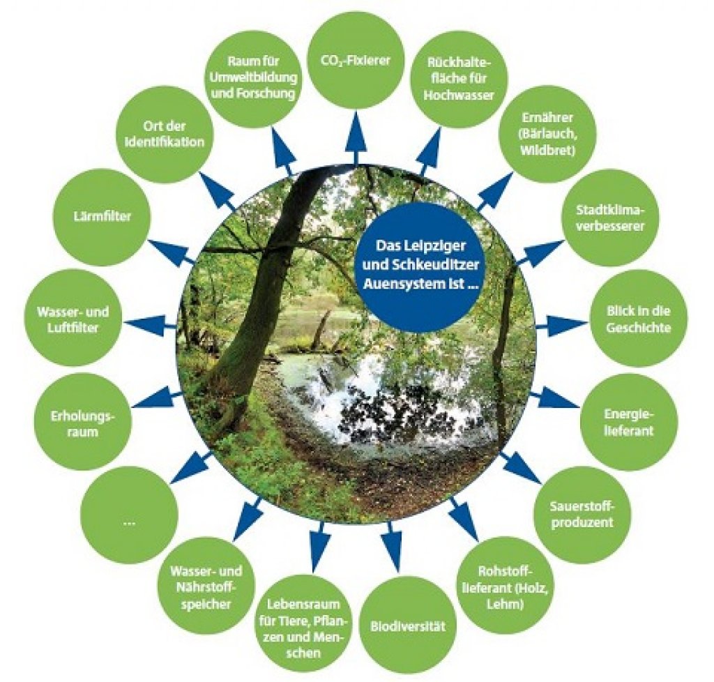 Einige dieser Leistungen sind in jedem Wald zu finden, andere sind den Auwäldern vorbehalten und stellen somit eine regionale Besonderheit dar. Noch ist dieser Ansatz relativ neu; Wirtschafts- und Naturwissenschaften sind am Beginn ihrer Forschungen, aber auch im Projekt Lebendige Luppe spielen Ökosystemleistungen eine wichtige Rolle. Mit der Revitalisierung ehemaliger Flussbetten wird ein wesentlicher Schritt für die Erhaltung des Auwaldes und somit auch für die Sicherung wichtiger Ökosystemleistungen getan.