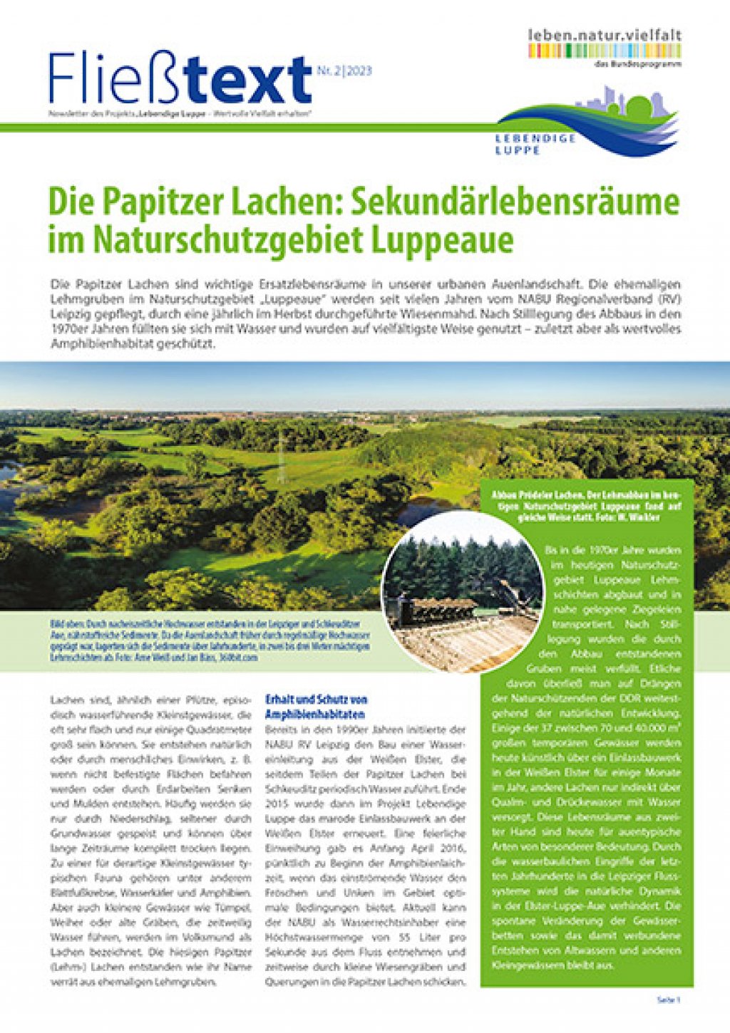Der aktuelle Fließtext Nr.2|2023 beschäftigt sich mit dem Schutz und Erhalt der Papitzer Lehmlachen als wichtige Ersatzlebensräume für eine Vielzahl an Tier- und Pflanzenarten. Besonders wichtig ist dieses Gebiet allerdings für eine Vielzahl an Amphibien, darunter die streng geschützte Rotbauchunke und der Kammmolch.