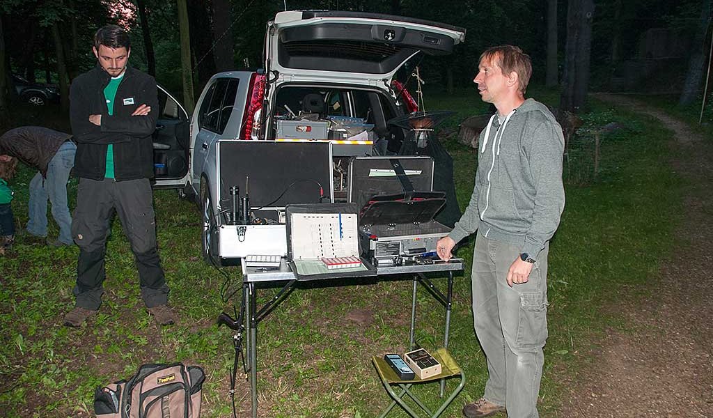 Bereits in der Dunkelheit erklärten Marco Roßner (GeoWerkstatt Leipzig e.V.) und sein Team, mit welchen technischen Hilfsmitteln man Fledermäuse aufspüren kann. Außerdem bauten die Experten Fangnetze auf und warteten mit den geduldigsten Fledermausfreunden bis in die Nacht hinein auf „ihre Beute“.