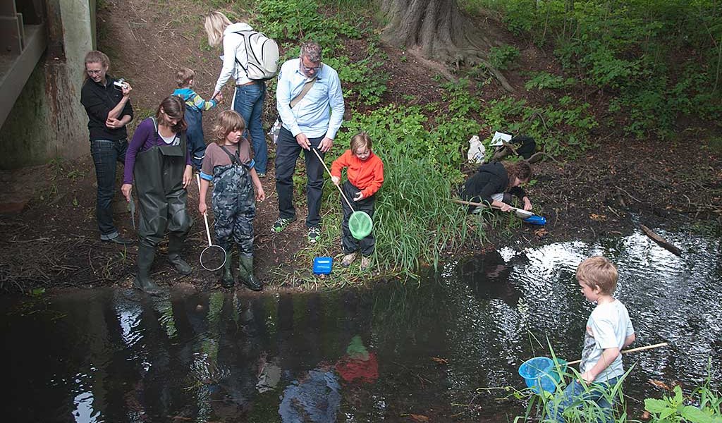 Insbesondere für die Kinder war der Ausflug mit Geografin Anna Herkelrath ein Erlebnis: Mit Wathose und Kescher bewaffnet begaben sie sich auf die Jagd nach den Kleinstlebewesen der Gewässer. Dabei gingen unter anderem Bachflohkrebse, Wasserskorpione und Tellerschnecken ins Netz – die im Anschluss an ihre Begutachtung und Bestimmung selbstverständlich wieder in ihren angestammten Lebensräumen landeten.