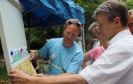 Schon vor dem offiziellen Start des größten Umweltfestes Mitteldeutschlands drängten sich große Besuchertrauben durch die mit bunten Ständen gefüllte Anton-Bruckner-Allee im Clarapark. Und dieser Strom an Interessierten und Neugierigen riss bis in den Abend nicht ab. Mit Karten- und Fotomaterial klärten wir über die abgeschlossenen Baumaßnahmen im nördlichen Projektgebiet und den aktuellen Planungsstand südlich der Neuen Luppe auf. Große Resonanz fand erneut unsere Gewässerbroschüre mit Portraits von 24 Leipziger und Schkeuditzer Fließgewässern. Auch die Ökosystemleistungsbuttons erfreuten sich großer Beliebheit - und das nicht nur bei den Kindern. Auch viele Erwachsene wollten gern ein/e Entschleuniger/in oder ein/e Hinterwäldler/in sein. Am Fließgewässerpuzzle konnten Große wie Kleine ihre Kenntnisse des Leipziger Gewässersystems unter Beweis stellen und mal wieder waren viele Bürgerinnen und Bürger erstaunt, wie viele Gewässer es in Leipzig gibt. Erneut kam man mit anderen Umweltverbänden, Stadtratsmitgliedern und Pädagog/innen ins Gespräch, so dass auch unsere pädagogische Handreichung für Grundschullehrer/innen mehrfach den Besitzer wechselte.
