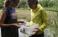 Mit extra aus Kanada eingeflogenen Fangreusen werden über etwa einen Monat lang die einzelnen Gewässer des Papitzer Lachenkomplexes untersucht – insgesamt 10 Reusen liegen für jeweils etwa 3 Tage in den verschiedenen Teichen. Kontrolliert und dokumentiert wird täglich. Die Wissenschaftler_innen halten alles genau fest: Jedes Individuum wird gemessen und gewogen, das individuelle Bauchmuster wird fotografiert, um Tiere bei späteren Fängen wiedererkennen zu können. Außerdem werden Abstriche von der Molchhaut genommen und im Labor untersucht. So will man herausfinden, ob der vielgefürchtete Chytridpilz, der für ein europaweites Amphibiensterben verantwortlich ist, auch die Amphibien der Papitzer Lachen bedroht. Natürlich werden die Tiere lebend gefangen – das Fangsystem basiert auf der Trichterform der Reusen, in welche die Tiere leicht hinein, aber schwieriger wieder herauskommen – und nach einer ausführlichen Untersuchung wieder freigelassen. Auch allerlei andere Wassertiere landen dabei in den Reusen: Gelbrandkäfer, Rückenschwimmer, Kaulquappen, Wasserspinnen und –schnecken… und man bekommt einen Eindruck davon, welche Räuber den Jungmolchen zu Leibe rücken. Nicht selten wird ein „angefressener“ Molch aus der Reuse geholt. Gut, dass Molche die Fähigkeit besitzen, komplett verlorene Gliedmaßen und Organe neu auszubilden!