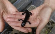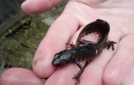 Die Reusen sind eine gute Methode, den Bestand der Molche in Gewässern zu erfassen. Doch dort halten sich die Tiere nur für einige Monate auf. Im Sommer verlassen die Molche das Wasser und sind im Sommer, Herbst und Winter an Land, unter Stein-, Laub- und Totholzhaufen zu finden. Um mehr über ihre Lebensräume und Strategien an Land zu erfahren, sind andere Untersuchungsmethoden gefragt. An dieser Stelle kommen Monitoring-Hunde ins Spiel. Sie werden darauf trainiert, die Molche an Land zu finden und möglichst störungsarm auf sie aufmerksam zu machen. Monitoring-Hund „Zammy“ war am 18. Tag des Molchfangs daher zu Trainingszwecken mit von der Partie. Vorerst wird er auf den Geruch der Molche konditioniert und lernt anhand von kurzzeitig an Land „ausgesetzten“ Tieren, diese zu finden. Beim Befehl „Check Molchi!“ weiß Zammy genau, was er zu tun hat: er erschnuppert den Molch und weist allein durch Schnauze und Augen auf den Aufenthaltsort des Molches hin – ohne zu bellen oder das Tier zu berühren.