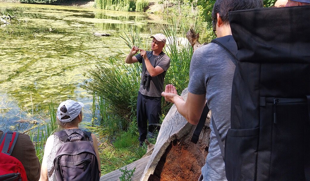 Etwa 30 Interessierte nahmen am 14.6. an der Libellenexkursion teil, die der NABU Sachsen zusammen mit dem Amt für Stadtgrün und Gewässer organisiert haben. Dieses Mal führte uns die Route durch das Leipziger Rosental. Trotz großer Hitze und Trockenheit konnten am – schon recht stark mit Algen bewachsenen – Hinteren Rosentalteich sowie an der Weißen Elster zahlreiche verschiedene Arten entdeckt und beobachtet werden. Deutlich wurde, dass sich „Klimawandelfolger“ wie die Feuerlibelle bei uns bereits fest etabliert haben. Weiterhin konnten Paarungsräder und Eiablagen der Feuerlibelle beobachtet werden, das Aushärten einer frisch geschlüpften Blutroten Heidelibelle, sowie eine spät fliegende Frühe Adonisjungfer an der Weißen Elster. Schon die Namen sind sehr bildhaft und wecken Interesse. Insgesamt konnten die Teilnehmer fast 20 verschiedene Libellenarten beobachten, darunter die Falkenlibelle, Großer Blaupfeil, Feuerlibelle, Großes und Kleines Granatauge sowie die Glänzende Smaragdlibelle.