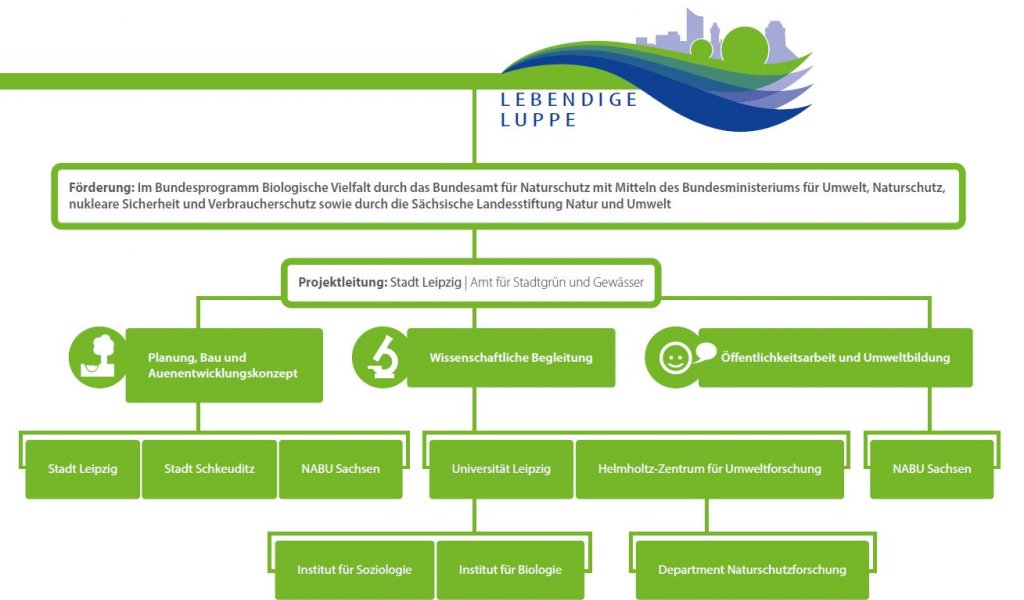 Die Umsetzung der Gewässerläufe übernehmen federführend die Städte Leipzig (Dezernat Umwelt, Klima, Ordnung und Sport im Amt für Stadtgrün und Gewässer) und Schkeuditz sowie der NABU Sachsen. Weitere Projektbausteine sind die Öffentlichkeits- und Umweltbildungsarbeit, die vom NABU Sachsen bestritten wird, sowie die natur- und sozialwissenschaftliche Begleitforschung. Das Helmholtz-Zentrum für Umweltforschung (UFZ) und die Universität Leipzig untersuchen die Auswirkungen der Flussrevitalisierung anhand eines Langzeit-Monitorings.